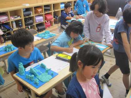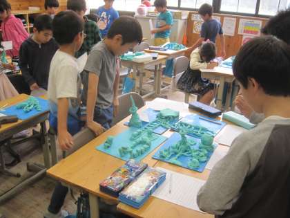 3年生が粘土で作った作品をしていました。