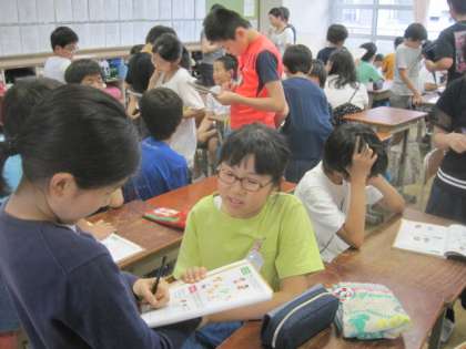 5年生は,外国語活動のテキストを片手に6年生と「Small talk」を始めました。