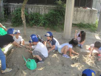 「ぜんこうの みなさん。すなばで あそんでね〜。」