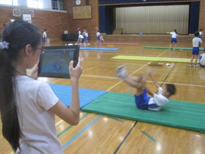 タブレットを使って,動画の資料を見たり,撮影しあったりしながら学習を進めていました。昨年度の研究を生かし,引き続きICTの活用もがんばっています。