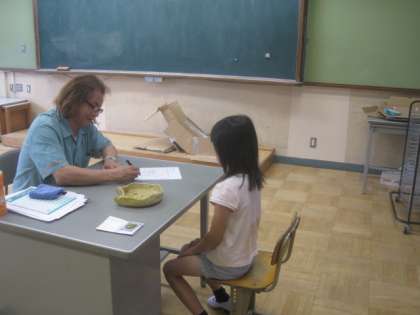 4年生が華展に向けて,どんなふうに花を生けようか相談していました。地域のゲストティーチャーの方が4年生一人一人と話をしてくださっています。