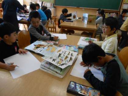 魚や昆虫,動物などを本で見つけて,一生懸命描いていた3年生。図鑑に載っている姿をよく見ながら,動きを工夫することや大きく描くことに気を付けながらがんばっていました。