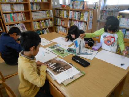 3年生が版画の作品作りをスタートしました。それぞれ好きな生き物,版画に表したい生き物を決め,図書館の資料を探してスケッチに取り組みました。