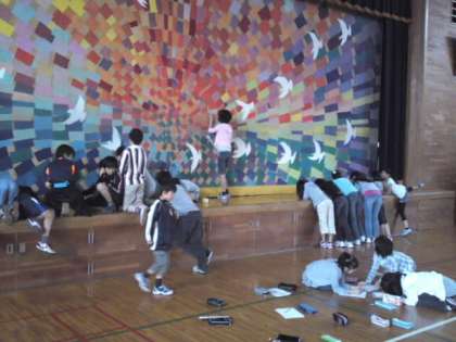 これまで,3年「まつり」4年「華道」5年「茶道」をテーマに学習を進めてきました。卒業年度にあたる6年生は,「西陣織」がテーマです。「西陣織」について学習を深めていく中で,伝統が息づく,自分たちの住むまちに愛着と誇りをもつことができるようにしたいと考えております。年間を通じての学習になります。年度途中には,「能」に関する学習も予定しています。写真は,校内にある西陣織に関するものを見学し,気づいたことや魅力に感じたことをワークシートに書き込んでいるところです。