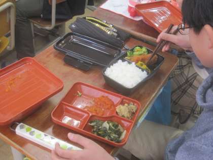 「入らない」という子ども,「足りない」という子どもと様々でしたが,中学校の給食やお弁当に向けて,よい経験になったょうです。