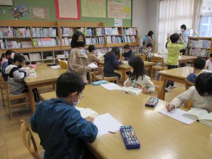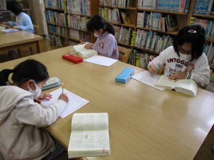 一つは,3年生以上で各学年ごとに行う「辞書早引き大会」,もう一つは,低学年・にじいろ学級での読み聞かせです。