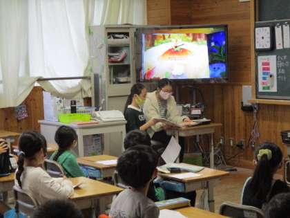読み聞かせは各教室で大きな画面に映し出し,行いました。自分たちで本を選んで,練習もしてきました。
