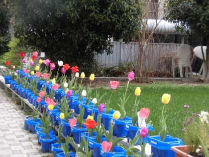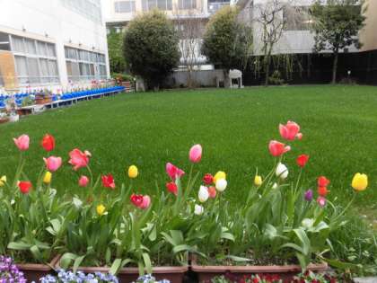 明日は,いよいよ入学式です。緑のプロムナードでは,チューリップの花が満開です。