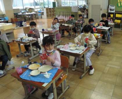 今日から給食開始です。1年生にとっては初めての給食です。