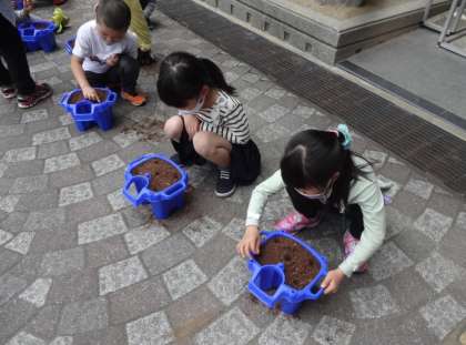 1年生はアサガオの種植えをしました。5つあけた穴に種を入れ,ふんわり土をかぶせます。明日から水やりもがんばりましょう!