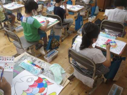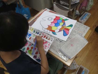 今日の図画工作は,子どもたちが楽しみにしていた初めての絵の具の学習です。道具の使い方を確認した後は,水の量を調節したり,混ぜ色をしたりして,お魚のうろこをていねいに塗っていきます。みんな集中して,すてきなお魚を完成させました!