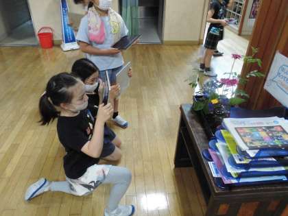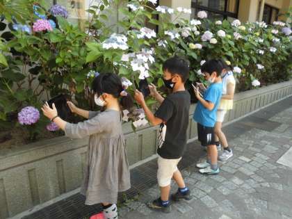 「6月」をテーマに絵を描きます。アジサイは大人気。カタツムリは見つからなかったね。写真をとって,特徴をとらえて絵にしていきます。