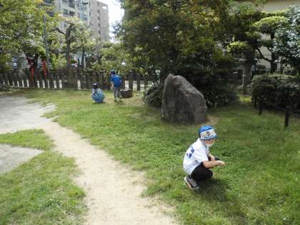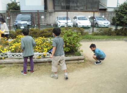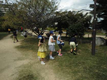 生活「いきものとなかよし」の学習で桜井公園に行きました。モンシロチョウ,シジミチョウ,ショウリョウバッタ,アリ,クモなどが見つかりました。意外とチョウが多く,華やかな公園でした。