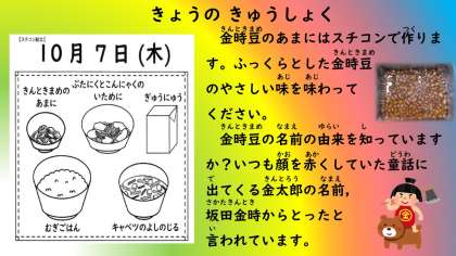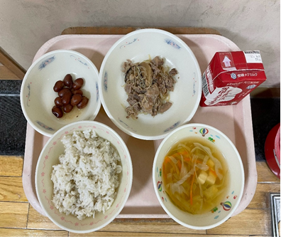 今日の給食は,麦ごはん 牛乳 豚肉とこんにゃくのいため煮 金時豆の甘煮 キャベツの吉野汁です。