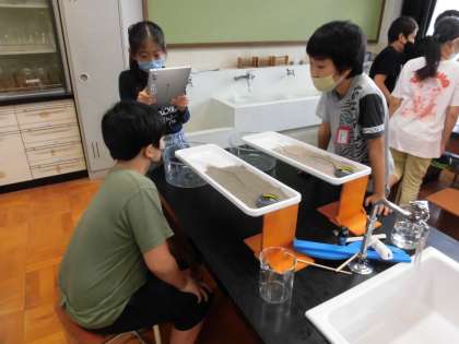 理科の学習では,流水実験の様子をロイロノートを活用して写真や動画に記録しました。