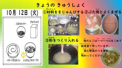肉だんごも数がたくさんになるように給食調理員さんが小さく作ってくださいました。