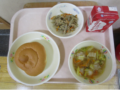 今日の給食は,バターうずまきパン 牛乳 肉だんごのスープ煮 ごぼうのソテーです。