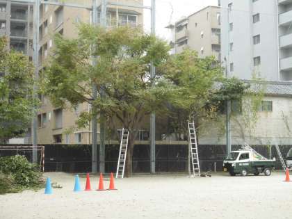 のびてきた枝を剪定してもらいました。西陣中央小学校にはけっこう大きな木があるので,切り取った枝もすごい量になりました。明るくなった感じもします。