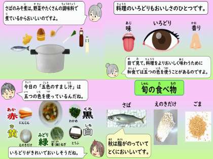 「五色のすまし汁」の実に「五色」(赤・緑・黄・白・黒)をいろどりよく合わせることで,おいしそうに見え,季節感を感じることができます。