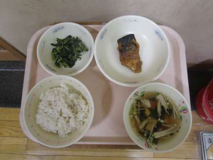 今日の給食は,麦ごはん さばのみそ煮 だいこん葉のごまいため 五色のすまし汁です。