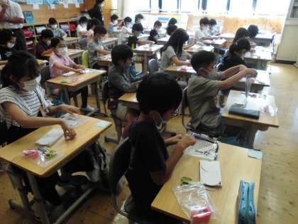 京都まなびの街生き方探究館の先生に教えてもらいながら,振動を電気に変える「圧電セラミックス」という部品を使った,光るタヌキのおもちゃを作りました。スマホやエンジンなどにも使われている部品だそうです。京都のモノづくりの歴史についても知りました。今日の学習をきっかけに新しい科学者が誕生するかな?!