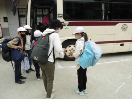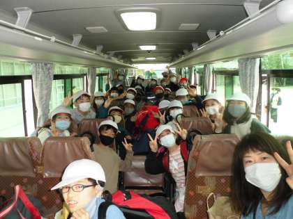 手の消毒をすませ,バスに乗り込みました。大荷物なのでちょっと大変です。では出発します!