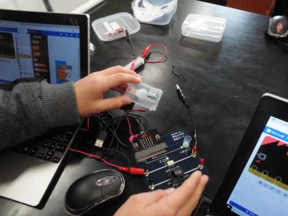 6年理科の電気の学習で,プログラミングに挑戦しました。身近にあるプログラミングを活用した例の中で,お店の入口は,人が近づくとドアが開いて,某コンビニはタラララ ララ〜 ラララララ♪と鳴ると,電気が動きと音に変わっていると意見が出ました。そこで授業では「人が動いたら,光がついて,数秒たったら消えるプログラムをつくる。」課題に挑戦しました。うまくいくと拍手がおこり,「やったぁ。」と両手を上げる姿が見られました。早く終わった子たちからは,近づくと「タラララ ララ〜 ラララララ♪」と,授業の始まりに口ずさんだ曲が鳴るプログラムを一生懸命作っていました。
