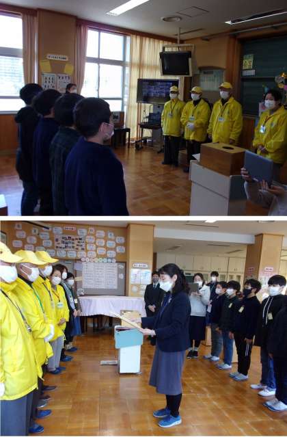 続いて,ボランティア感謝の会です。朝の見守りボランティアと図書館ボランティアの代表の方々に来ていただき,地域25委員会の児童がお礼の言葉をのべました。3年生が,地域の人への感謝を込めて作った鉾も,部屋をいろどりました。