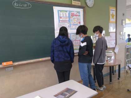 資料選択では,ロイロノートに送られた資料だけでなく,黒板に掲示している資料をもとにおともだちと意見交換する姿もありました。
