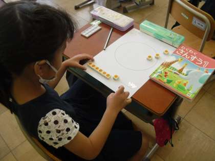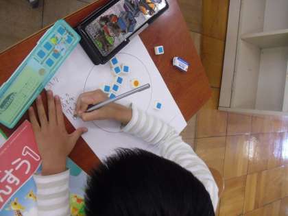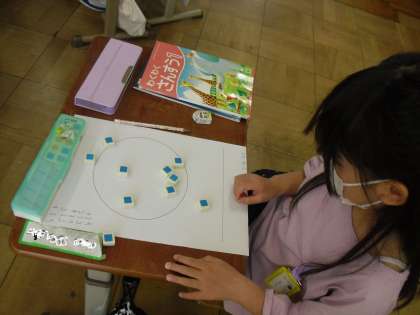 10の合成・分解の学習をしました。ブロックを指ではじき,円の中に入った数と入らなかった数を数えるゲームを通して,楽しく学ぶことができました。