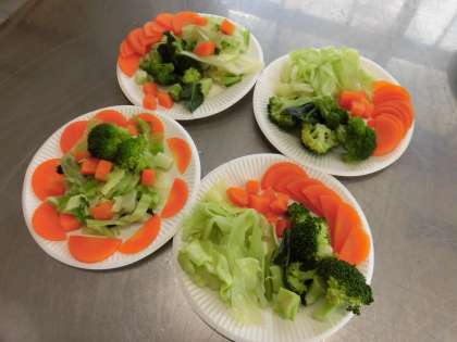 野菜の切り方や盛り付けを工夫して,ゆで野菜サラダを作りました。