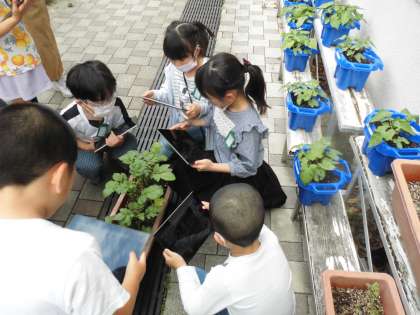 観察したことを友だちに伝える学習をしています。自分の決めた植物の特徴を上手に伝えるため,タブレットで写真をとり,わかりやすく説明をしました。