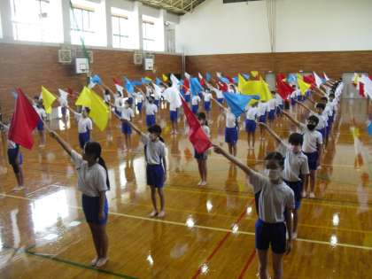 スポーツフェスティバルに向けて、フラッグ運動の学習を頑張っています。穏やかな曲調やアップテンポな曲調に合わせて子どもたちの振るフラッグが色鮮やかに舞い、その舞から子どもたちのスポーツフェスティバルに向けた気持ちが伝わってきています。最初は戸惑いや不安を感じながら取り組んでいた子どもたちの表情が少しずつ引き締まってきており、子どもたち全員から「みんなで一つの素晴らしい演技をするぞ」という気持ちが感じられるようになってきました。まだまだ、未完成ですが、「とめる、きめる、そろえる」を意識して全員で素晴らしいフラッグ運動ができるよう頑張ります。