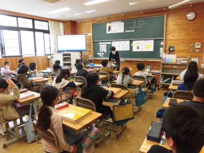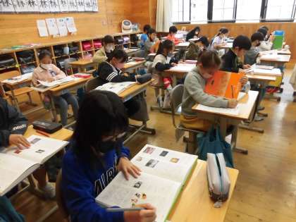 学校司書の先生に、百科事典の使い方を教えてもらいました。百科事典も国語辞典と同じように50音順になっていることや「はしら」を見て調べたい言葉がのっていそうなページの見当をつけて見出し語を探すことなど、基本的な使い方について学んだ後、ポプラディアを使ってクイズに取り組みました。自分で調べて、知識を広げる楽しさを知ることができました。
