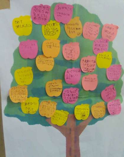 自分がしてもらって嬉しいことや言葉などを、りんごの付箋に書いて貼りました。