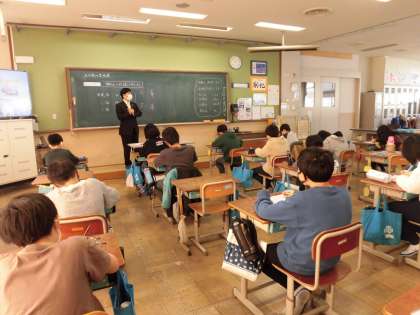 今日は、弁護士や美容業、郵便事業など色々な職種で実際に働いている方から、働くことや仕事内容など様々なお話を聞きました。「働くうえで大切にしていることは何ですか。」「どうしてその仕事をしようと思ったのですか。」など積極的に質問をする姿も見られました。働く人のお話から、自分の将来の夢とつなげて考えることができました。
