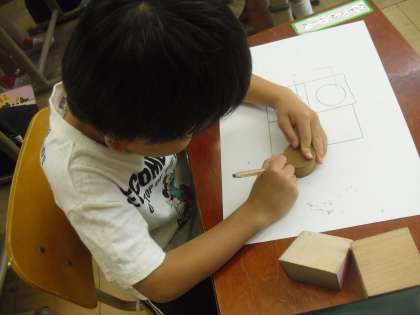 「はこ」や「つつ」の形をした積み木を写して、絵をかきました。ロボットやぶどう、家など想像を広げながら楽しんでいました。休み時間もいろいろな形に親しむ姿が見られます!