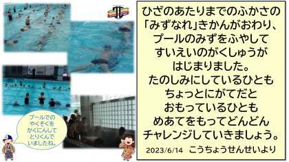 13日(火)から、水位をあげて、いよいよ全学年の水泳の学習が始まりました。