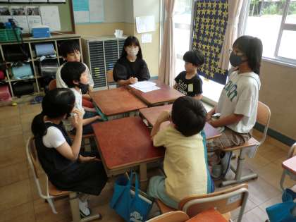 1〜6年生のたてわりグループで交流を深めるフレンドリー活動が始まりました。今日は自己紹介をした後、次回の遊びを考えたり、簡単にできる遊びで楽しんだりしました。