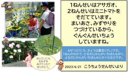 「つるがおとなりのところにいっちゃった」「やっと小さな実ができたよ」「今日は暑くなるからお水をいっぱいあげよう」など水やりをしながら話しています。