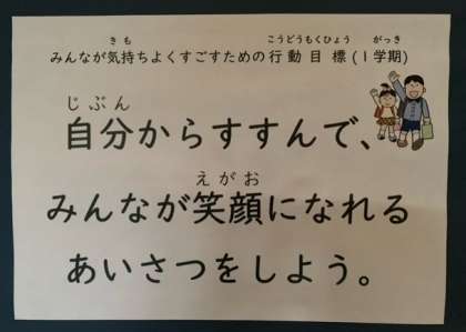 みんなが気持ちよくすごすための全校の行動目標(1学期)は「自分からすすんで、みんなが笑顔になれるあいさつをしよう」です。