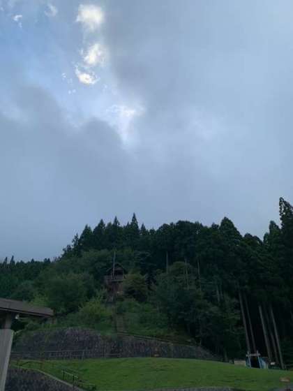 山に霧がかかっていますが、雲の合間から光がさしています。