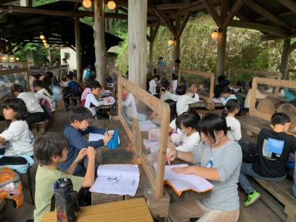 野外炊事場で振り返りをしました。