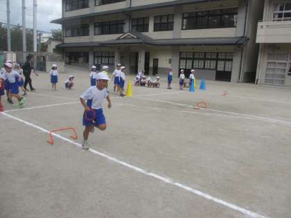 折り返しリレーを練習中です。グルグル回ったり、ぴょんぴょん跳んだり、置き換えをしたりとがんばっています。どうしたら速くなるかも考えながら取り組んでいます。