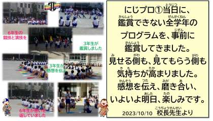 明日は、ぜひ、学校に足を運んでいただき、子どもたちの輝く姿をご覧になってください。