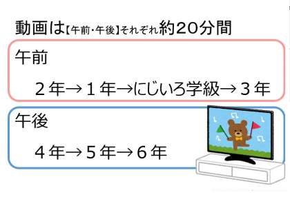 〇 保健室前に、これまでの取組の軌跡をまとめた動画コーナーがありますので、発表が始まるまでにぜひご覧ください。(各学年7分間程度です)終了後戻ってご覧になっても構いません。