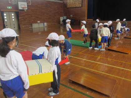 今日から「とびばこあそび」の学習が始まりました。2段や3段のとびばこで「ふみこしとび」「またぎのり・おり」などをしました。準備や片付けも協力してできました。