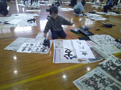 体育館で、書初めをしました。