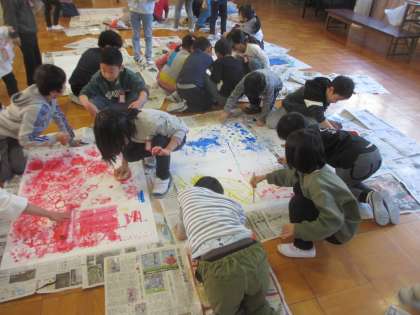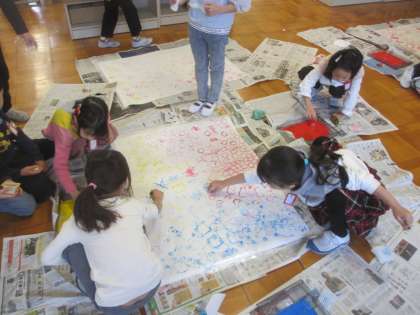 カップや野菜、ラップの芯など、身近な材料に絵の具をつけて、形をうつしとりました。手形をうつしとるのも楽しそうで、あっという間に紙がカラフルになりました。明日は、自分だけの作品づくりをします。色の数も増えるので、さらに素敵な作品になりそうです。