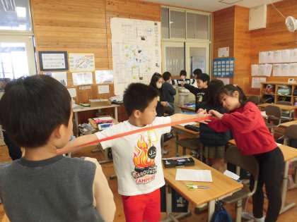 両手を広げた長さが何センチになるか、予想しながらはかってみました。